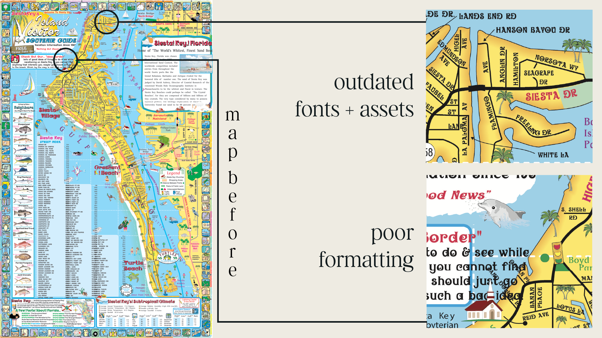 In early 2024, I was commissioned for a freelance project to completely redesign a map of Florida’s Siesta Key for a local news publication. The client requested updates to the typography, modifications to the iconography, and increased space for advertising. Due to the unavailability of the original design file, the project required innovative problem-solving. I utilized Illustrator for the primary design work and Photoshop for asset editing, resulting in a final deliverable that is clearer and meets the client’s requirements.In addition to the map redesign, I was also tasked with editing weekly video episodes for the publication’s YouTube podcast. I was provided all media assets, which I synthesized and refined to enhance video quality and ensure clear, balanced sound. This ongoing project has honed my ability to meet tight deadlines while maintaining consistent quality. Each episode demanded careful attention to detail and a cohesive visual style to align with the publication’s branding.